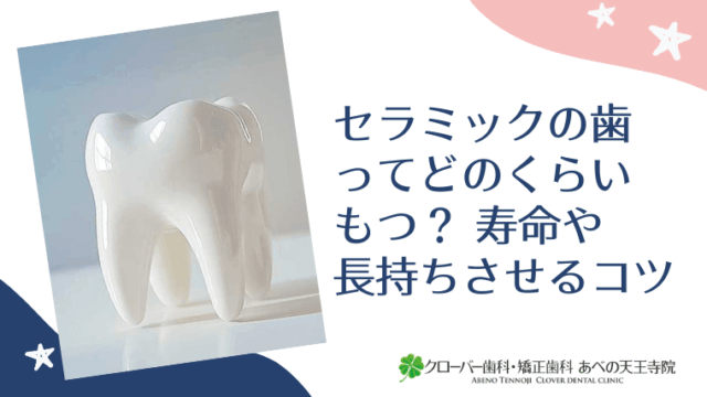 審美歯科 セラミックの歯ってどのくらいもつ?寿命や長持ちさせるコツ 2025年5月8日 admin https://www.abeno-tennoji-clover.com/faq/wp-content/uploads/2021/06/abeno-tennoji-clover-logo-white.png よくあるご質問 クローバー歯科・矯正歯科あべの天王寺院